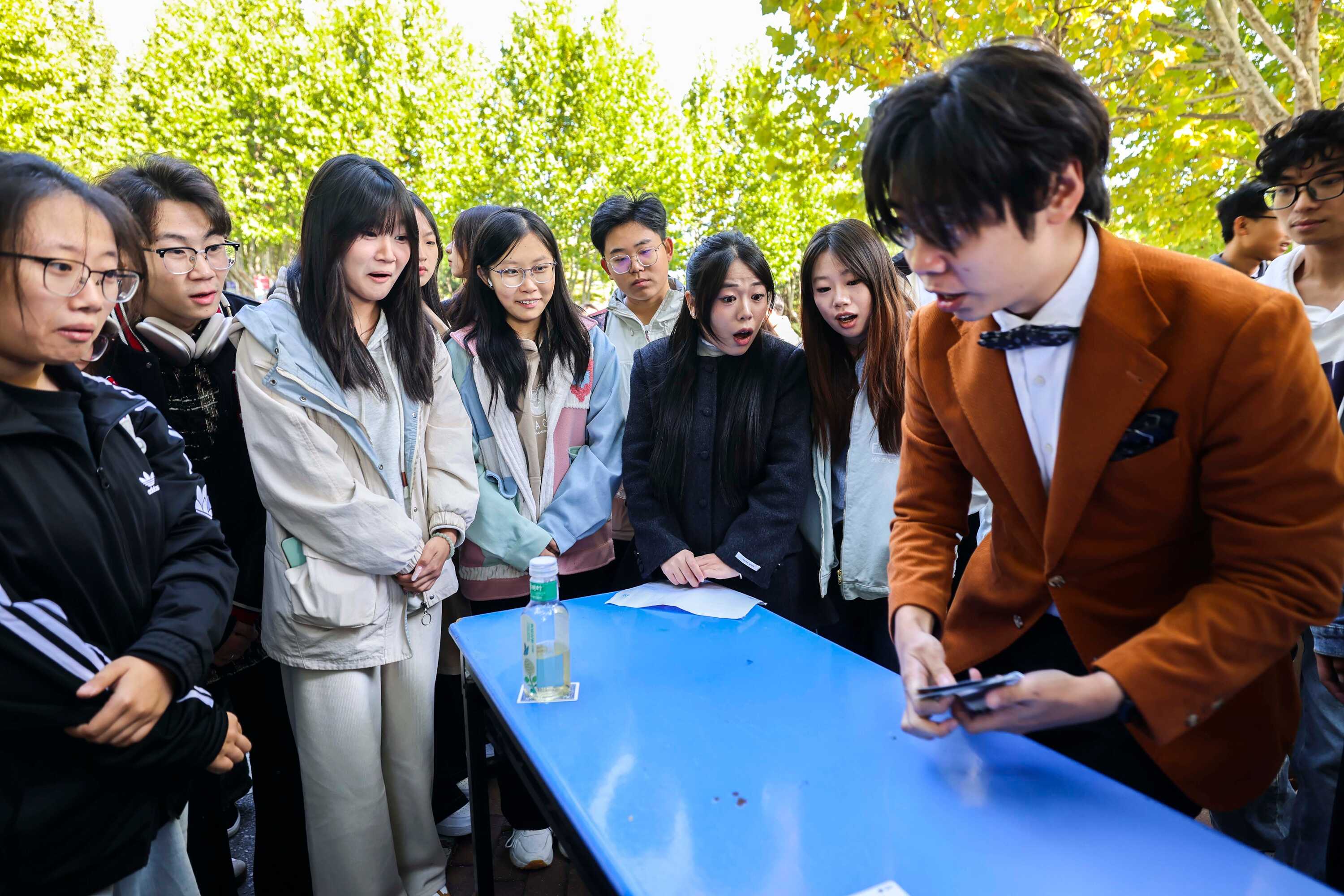 活动现场,古彩戏法的典雅、飞牌魔术的炫酷、近景硬币、心灵、预言、纸牌的巧趣轮番上演,不仅让大学生们沉浸式感受了魔术艺术的独特魅力,更点燃了新生加入魔术社团的热情,咨询报名的队伍在纳新展台延伸。