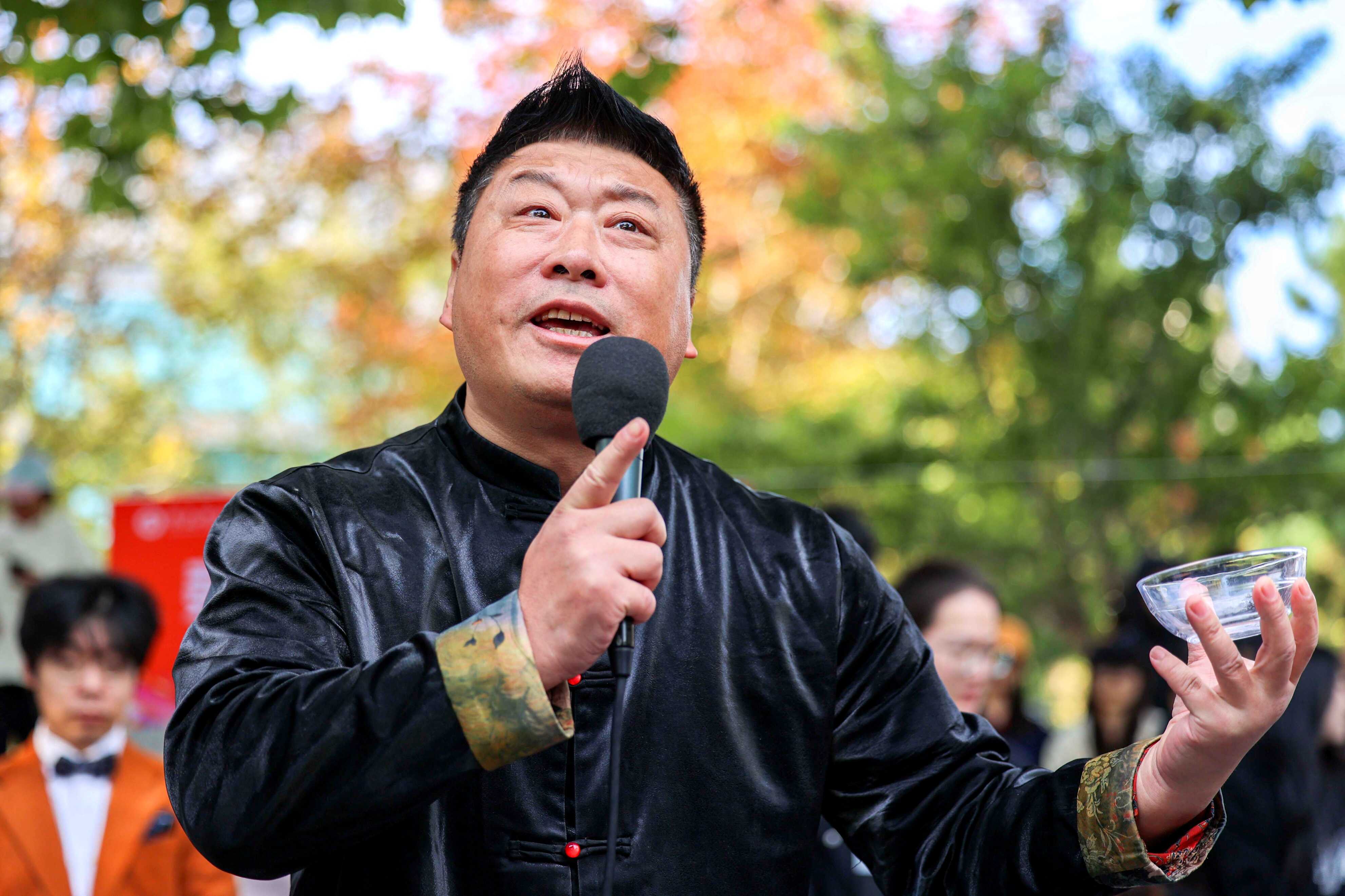 古彩戏法省级非遗传承人、青岛市杂技协会副秘书长王富秋率先登场,他演绎的“金杯入地,旱地拔杯”堪称传统技艺的活态展示,在短短几分钟的表演中,将古彩戏法“无中生有”的神奇魅力展现得淋漓尽致,引得全场同学们惊呼连连。